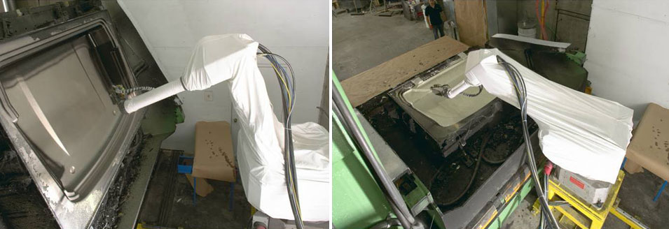 Robot spraying resin over preform.